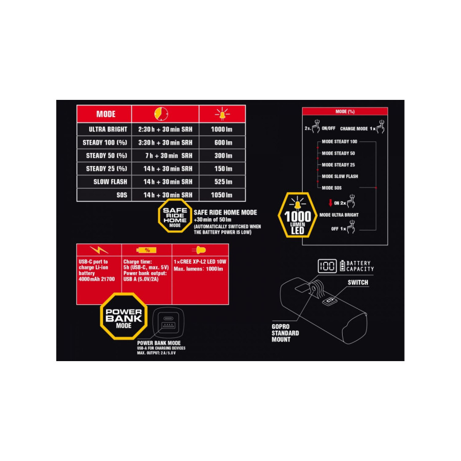 - Потужність світла: 1000 лм – оптимальний рівень для комфортного і безпечного руху в міських та заміських умовах;
