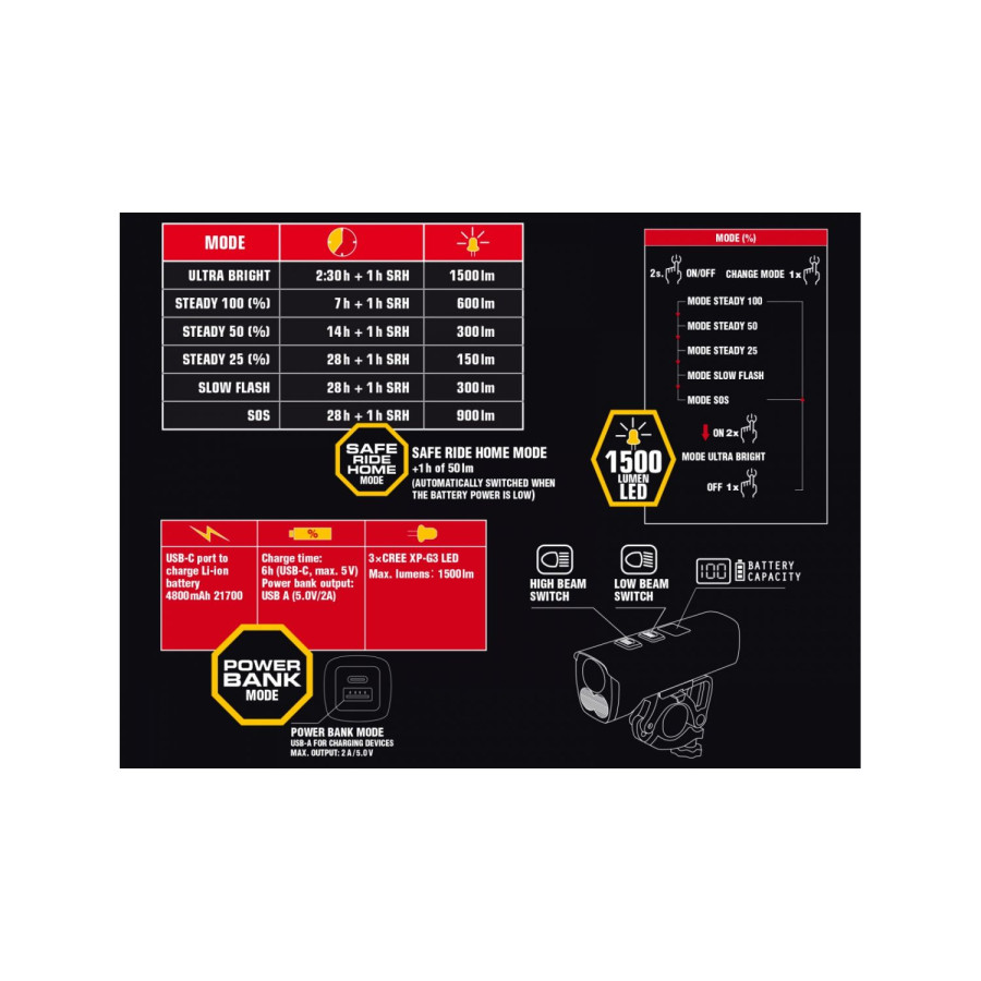 Інноваційна акумуляторна батарея ємністю 4800 мАч гарантує довгу автономну роботу, а зручний USB-роз’єм для зарядки робить процес відновлення енергії швидким та легким. Міцний корпус з алюмінієвого сплаву захищає ліхтар від механічних пошкоджень, а захист від вологи IPX65 дозволяє використовувати пристрій у будь-яких погодних умовах.