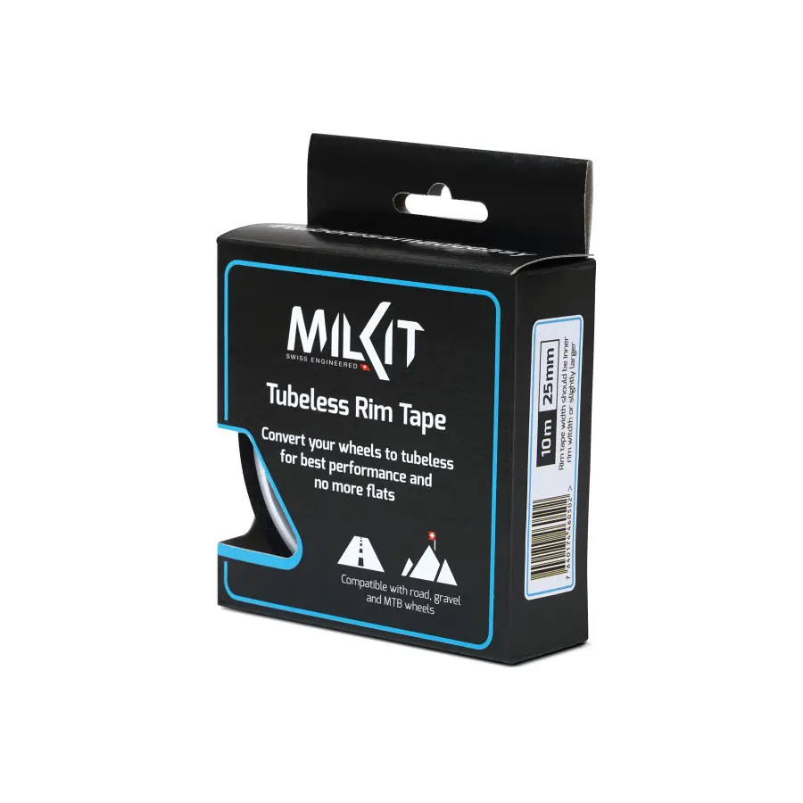 Використання стрічки Rim Tape milKit, 25 мм оптимізує захист обода та знижує шанси проколів під час руху. Вона спеціально розроблена для чіткого кріплення, що гарантує відсутність зсуву під час експлуатації велосипеда, навіть в екстремальних умовах.