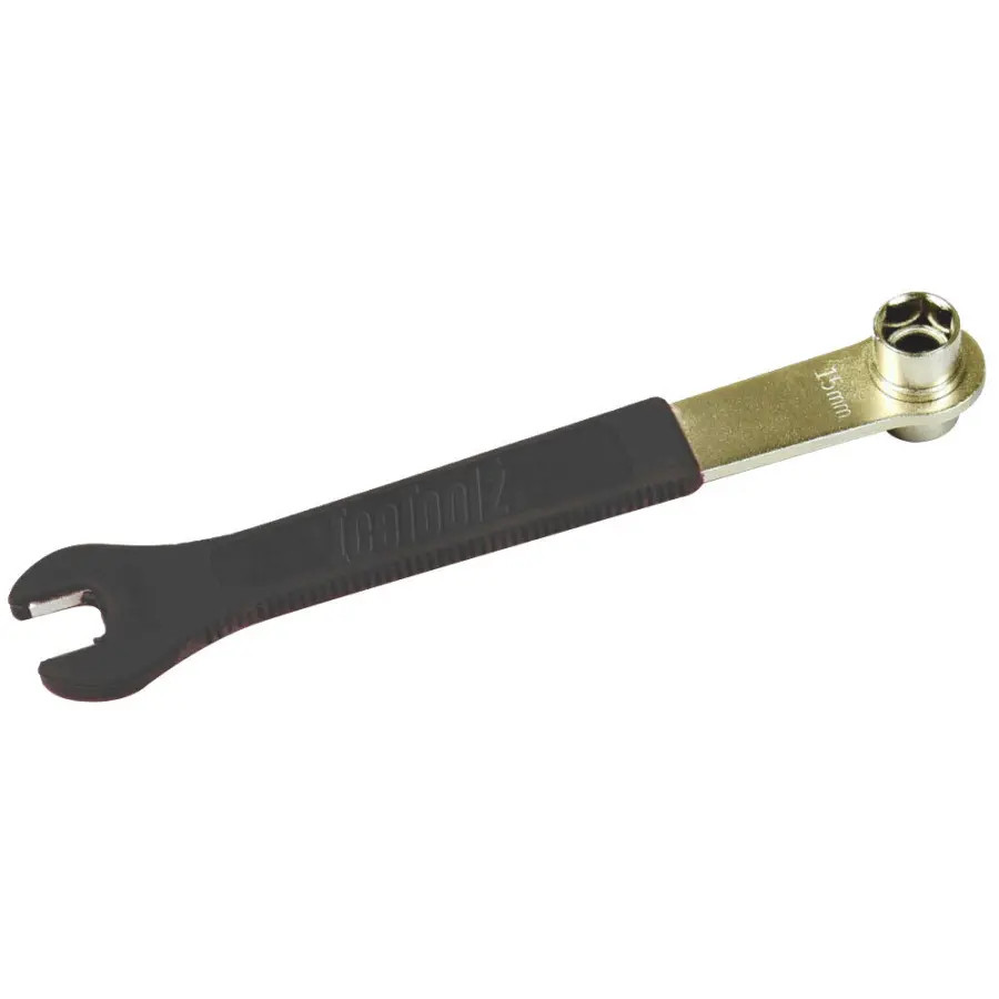 - Оптимальний розмір – 15 мм ключ ідеально підходить для педалей, що використовують стандартні гайки, а торцевий 14x15 мм ключ дозволяє працювати з каретковими болтами різних типів.